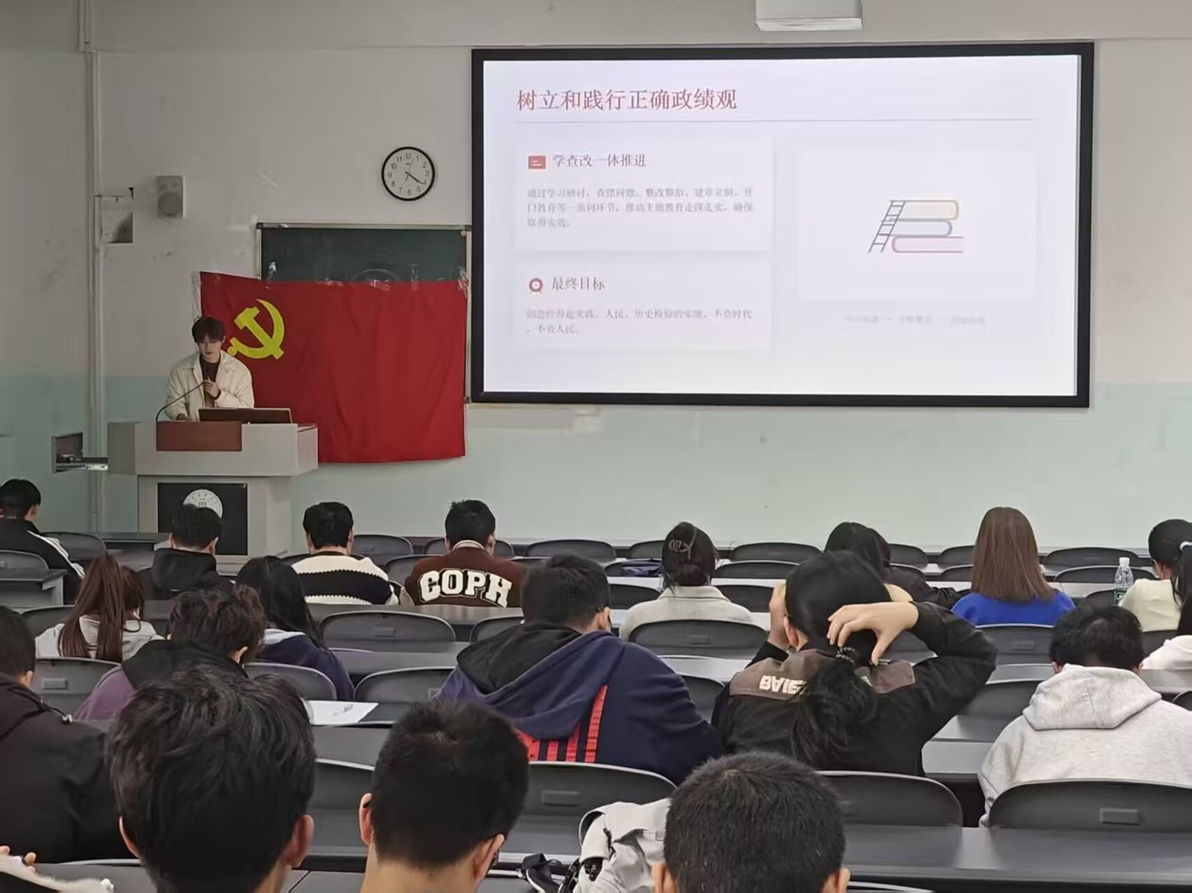 会上,主讲人李锦轩同志领学了树立和践行正确政绩观的相关文件,明确提出要将“为民造福”与“真抓实干”贯穿工作始终。随后,会议深度研习了习近平总书记在江苏代表团审议时的重要讲话及关于担当作为的重要论述,重点围绕“新质生产力”与“高质量发展”展开探讨,并前瞻性地学习了2026年政府工作报告中的教育工作部署。针对纪律与作风建设,会议专题传达了省委第九巡视组巡视学校党委的工作动员会精神,要求全体党员提高政治站位,全力配合巡视工作。最后,通过观看“青年党员说”专题视频,支部成员以先进典型张钰同志为标杆深度查摆不足,进一步筑牢了基层党支部的战斗堡垒作用。