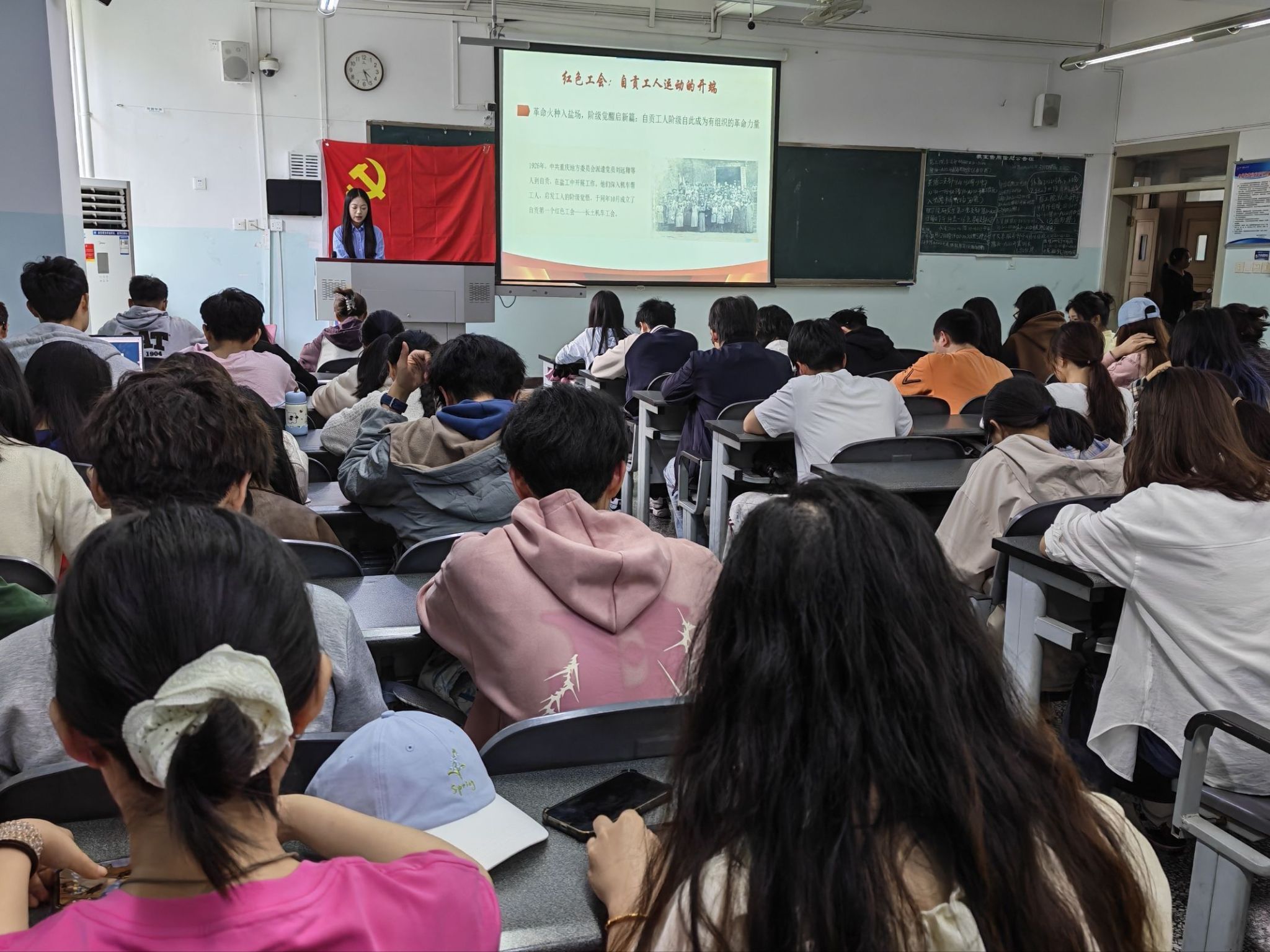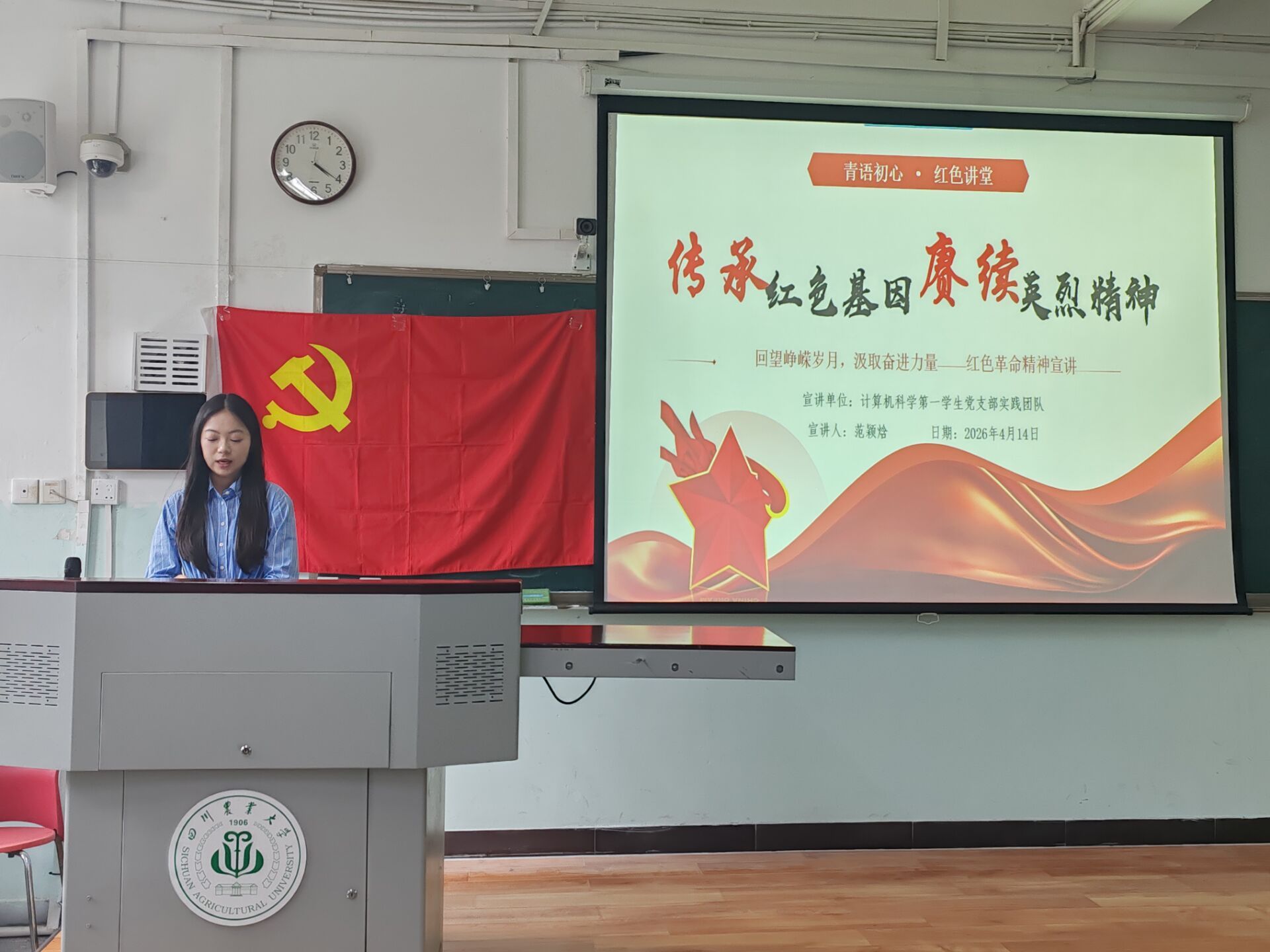 2026年4月14日下午,计算机科学第一学生党支部“青语初心”红色系列讲堂第二讲在10教A212正式开讲。本次讲堂以“传承红色基因、赓续英烈精神”为主题,由支部党员范颖焓同志担任主讲,支部全体党员及入党积极分子共计250余人参学。