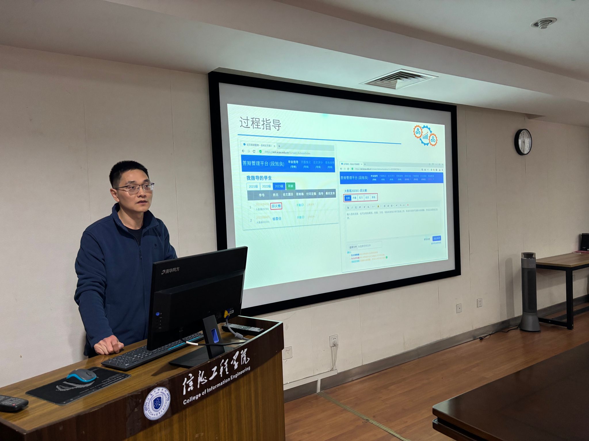 针对近期开展的2027届本科毕业论文导师双选工作,会议开展了“毕业论文管理系统”培训和毕业论文指导经验分享。副院长段旭良围绕答辩管理、过程指导与AI辅助等模块对系统功能和建议流程进行了详细讲解和说明。毕业论文指导经验由蒲海波教授分享,他从学生未来规划指导与毕业选题两个维度出发,强调要引导学生将毕业设计与职业发展相结合,同时分享了在指导过程中的常见问题及解决经验。