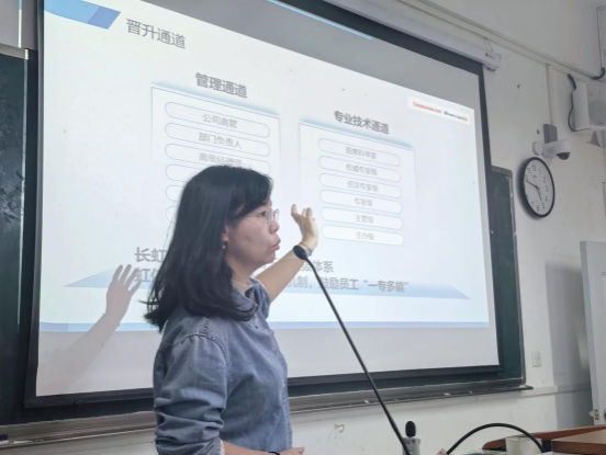 长虹创始于1958年,是我国“一五”期间的156项重点工程之一,现已发展为千亿级跨国企业集团,而四川虹信软件股份有限公司是四川长虹集团数字产业领域旗舰企业。“我们不是‘写代码的公司’,是‘帮千行百业学会用代码的伙伴’”这句话让现场同学迅速理解了企业“产业数字化服务商”的定位。企业业务中心—泛ERP事业部负责人文阳和企业业务中心高级项目经理邱艳萍还分别介绍了公司的企业文化、员工工作生活环境等企业相关信息,指出公司提供完善的人才培养体系及晋升渠道,丰富的业余活动及多样性的福利待遇。