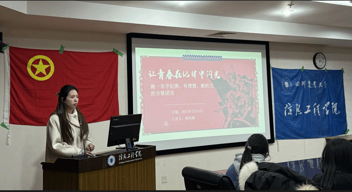 为深化团员思想引领、强化组织纪律观念,培育新时代合格团员,12 月 4 日,信息工程学院于综合楼 414 会议室举办 “让青春在纪律中闪光” 主题团校第三讲。课程由党委办公室老师杨纯婧主讲,学院全体新发展团员参与。