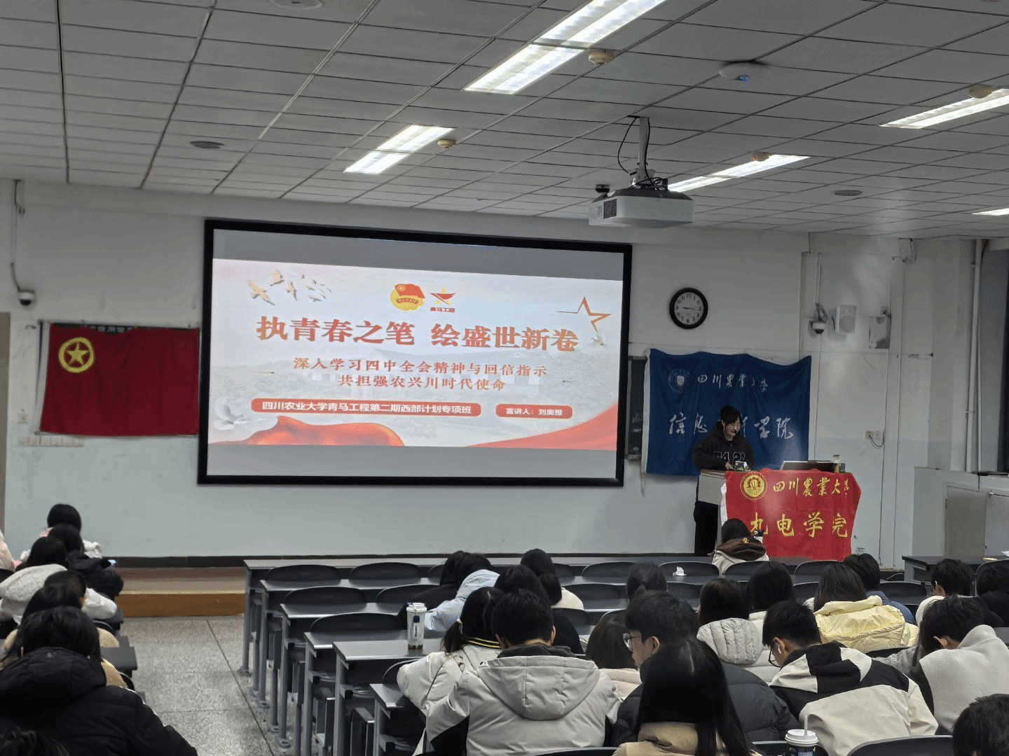 活动在全体团员齐唱团歌的激昂旋律中拉开序幕,嘹亮歌声凝聚起奋进向上的青春共识。校第十二期青马班成员刘奥雅以“执青春之笔,绘盛世新卷”为主题开展宣讲,深入解读全会精神与回信指示内涵,结合强农兴川时代使命,为团员们阐释青年一代应有的责任与担当,让理论学习入脑入心。