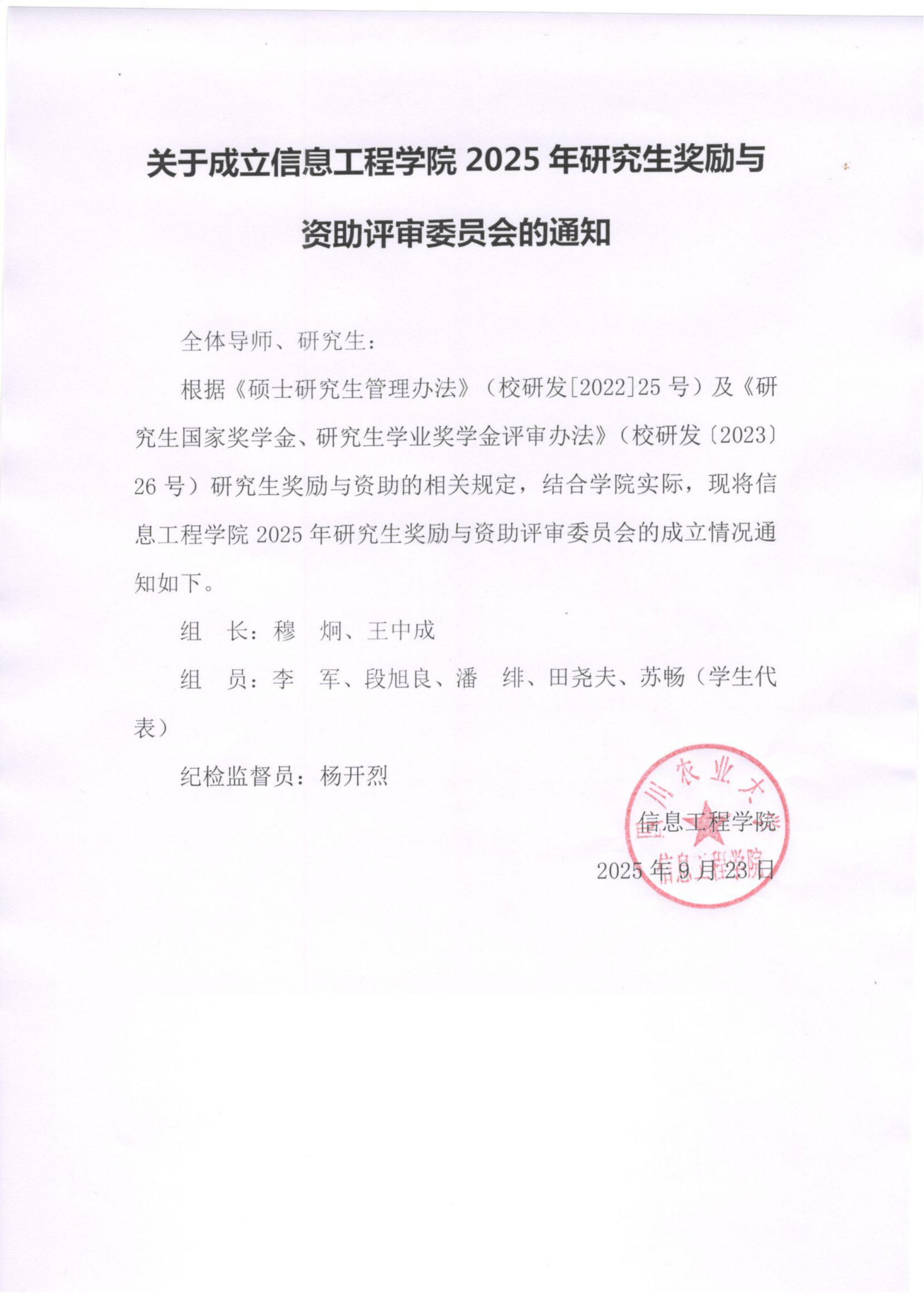 关于成立信息工程学院2025年研究生奖励与资助评审委员会的通知