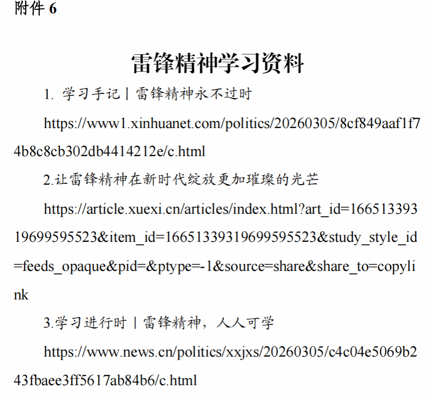 为传承和弘扬雷锋精神(附件6),践行社会主义核心价值观,引导团员青年通过主题班会、社区服务、敬老助老、环保公益等形式,深入学习领会雷锋精神的时代内涵。各支部可结合实际,开展雷锋精神系列宣传,组建常态化志愿服务队,推动学雷锋活动融入日常、化作经常。引导青年在奉献中锤炼品格、在服务中增长才干,让雷锋精神在新时代绽放新光彩,以青春之我书写志愿服务的动人篇章。