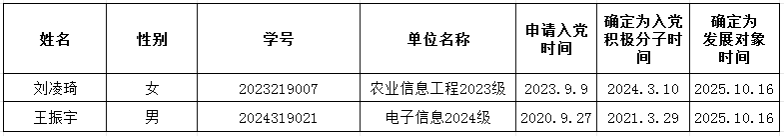 经支部委员会研究,报信息工程学院党委备案同意,刘凌琦等2位同志被列为党员发展对象(名单见附件)。为进一步增强发展党员工作的透明度,确保发展新党员的质量,根据《中国共产党章程》和《中国共产党发展党员工作细则》,现将发展对象的基本情况予以公示。
