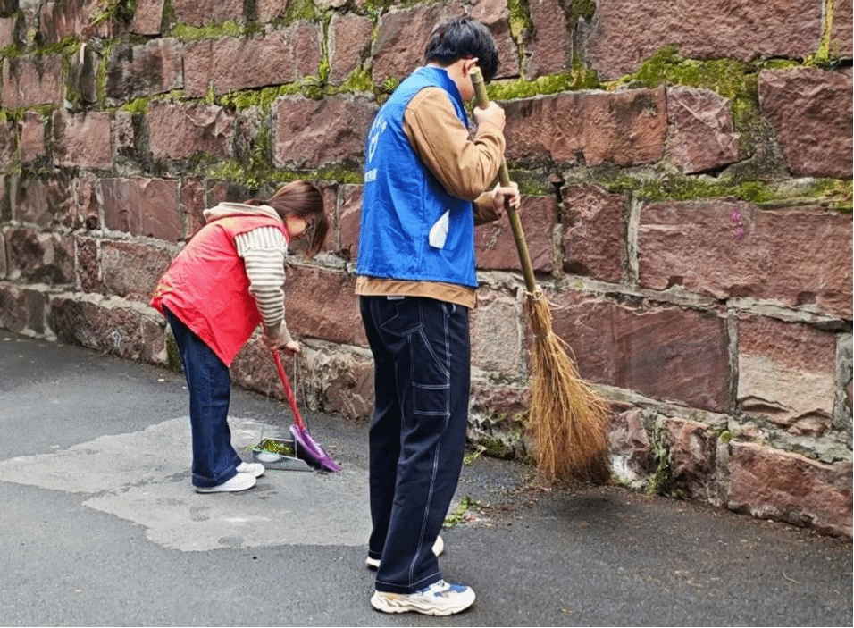 活动伊始,同学们身着志愿服,分成若干小组,在社区工作人员的引导下有序开展环境整治工作。大家手持扫帚、铲子、垃圾袋等工具,深入居民楼间的空隙,仔细清扫积存垃圾、灰尘与杂物。部分角落长期无人清理,卫生状况较差,但同学们不怕脏、不怕累,俯身弯腰、耐心清理,确保不留死角。与此同时,另一组同学重点针对楼道墙面、楼梯扶手及住户门边违规粘贴的小广告进行清除。面对顽固的胶痕,大家先用喷壶浸湿,再用铲子细致铲除,最后用抹布擦拭干净。经过两个多小时的共同努力,共清扫楼道10余处,清理违规广告20余处,社区楼道环境焕然一新。